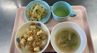 マーボー豆腐丼 中華スープ 中華風あえ牛乳 パイン缶 クラッカー