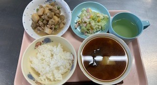 ごはん 炒り鶏 みそ汁 コーンサラダ牛乳 鮎菓子