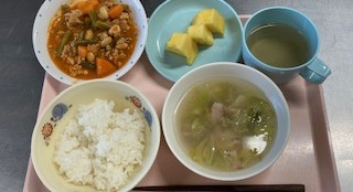ごはん 大豆と豚肉のケチャップ煮 春雨スープ パイナップル牛乳 ポテトスナック