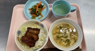 みそかつ丼 かきたま汁 お浸しケーキ 牛乳 アレルギーケーキ