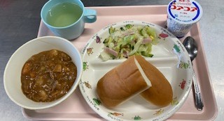 米粉ロール ビーフシチュー コールスロー ヨーグルトビスケット チーズ りんごジュース