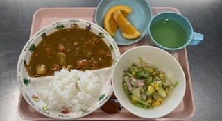 チキンカレー フレンチサラダ オレンジ牛乳 田舎パイ