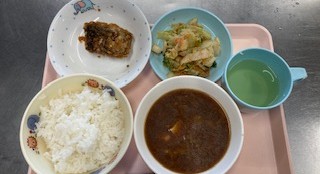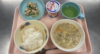 ごはん ポークシチュー アスパラサラダ ヨーグルトポテトスナック りんごジュース