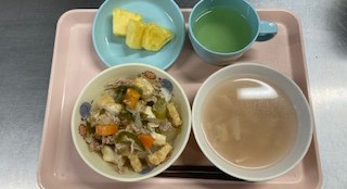 生揚げの中華丼 じゃがいもスープ パイナップル野菜ジュース ポテトスナック