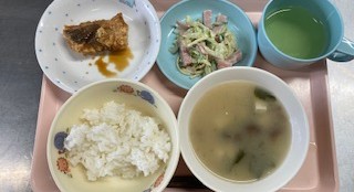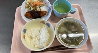 ごはん 照り魚 なめこ汁 スパゲッティサラダクラッカー カルピス