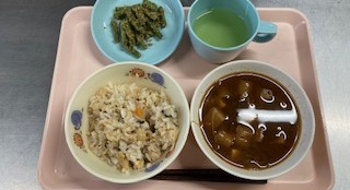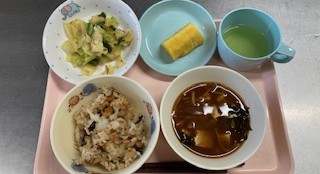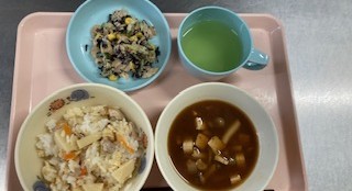 たけのこごはん みそ汁 切干大根とひじきのサラダ牛乳 ソフトあられ