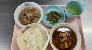 ごはん 肉じゃが みそ汁 納豆あえカルピス あられ