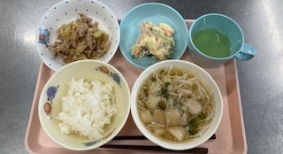ごはん 豚肉のしょうが炒め そうめん汁 ポテトサラダ牛乳 わらび餅