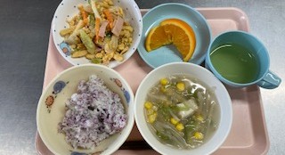 ゆかりごはん 拌八宝 春雨スープ オレンジ牛乳 ビスケット