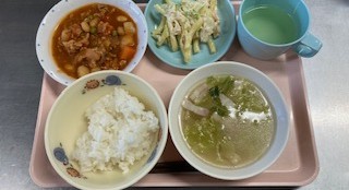 ごはん ポークビーンズ レタススープ マカロニサラダ牛乳 オレンジ ビスケット