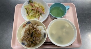 豚丼 ニラスープ 中華風あえ パイナップルせんべい 飲むヨーグルト