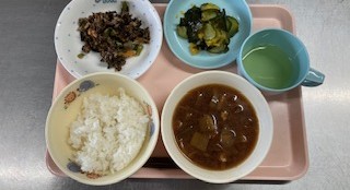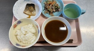ごはん 煮魚 みそ汁 切干大根とひじきのサラダ牛乳 野菜かりんとう