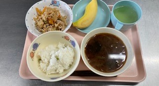 グリンピースごはん みそ汁 鶏肉と切干大根の煮物 ばななプリン