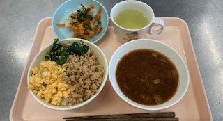 三食ごはん お浸し みそ汁牛乳 ドーナツ