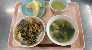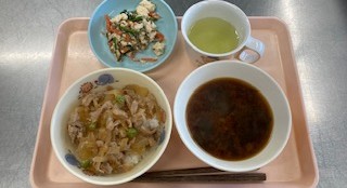 スタミナ丼 チンゲン菜スープ りんごフルーツヨーグルト