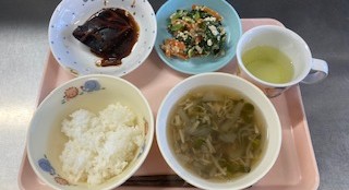 豚丼 白和え みそ汁野菜ジュース ビスケット チーズ