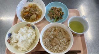 ごはん 肉じゃが 切り干し大根納豆あえ そうめん汁牛乳 サブレ