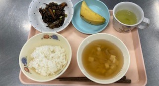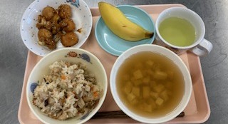 ごはん ひじきの炒め煮 すまし汁 バナナ牛乳 さつまいもケーキ