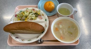 鶏肉と白菜のシチュー フレンチサラダ 米粉ロール みかん牛乳 田舎パイ