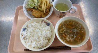 ごはん 白身魚のカレー揚げ ポテトフライ 付け合わせ 五目汁牛乳 レンコンチップス