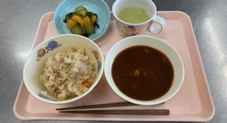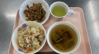 さつま芋ご飯 豚汁 お浸し牛乳 ポテトスナック