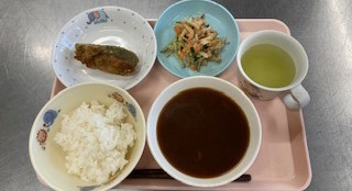 玉ねぎと豚肉のカレー炒め チンゲンサイスープ 柿牛乳 ビスケット