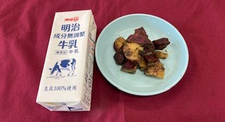さつまいもとささみの天ぷら おかか和え みそ汁牛乳 せんべい
