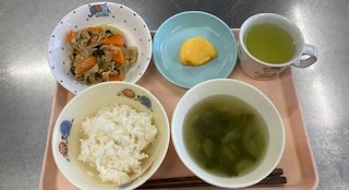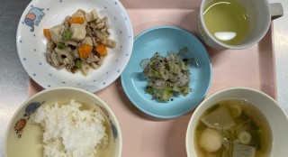 里芋ごはん 五目汁 酢の物野菜ジュース チーズ せんべい