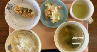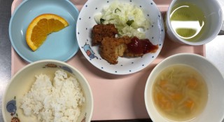 ごはん チキンナゲット じゃがいもスープ 付け合わせ オレンジ牛乳 せんべい