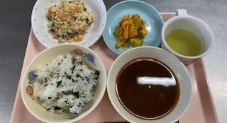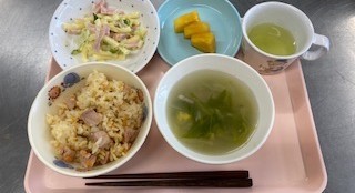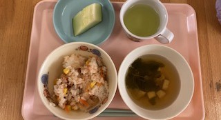 わかめごはん みそ汁 炒り豆腐 かぼちゃサラダ牛乳 とうもろこし
