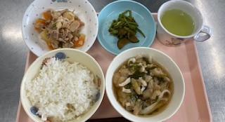 ごはん 肉じゃが きしめん汁 みそあえ牛乳 コーンスナック(変更になりました)