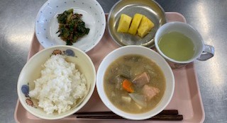 ごはん 石狩鍋 おかかあえ パイナップル牛乳 サーターアンダギー