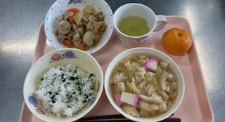 わかめごはん しのだうどん 旨煮 みかん牛乳 ばなな チーズ