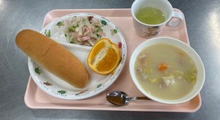 ロールパン 鶏肉と白菜のシチュー 大根サラダ いよかん牛乳 マカロニあべかわ