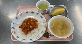 カレー風味のトマトライス コンソメスープ バナナ牛乳 わらび餅