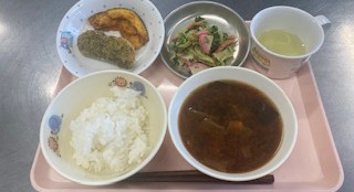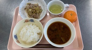 ごはん とんちゃん焼き みそ汁 みかん牛乳 ポテトスナック