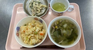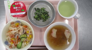 チキンピラフ チンゲンサイスープ マカロニサラダカルピス ひなあられ