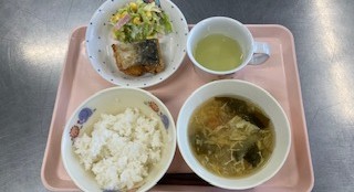 ごはん さわらの竜田揚げ かきたま汁 コーンサラダ牛乳 ケークサレ