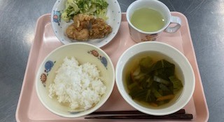 ごはん 鶏の唐揚げ 沢煮椀 付け合せ牛乳 せんべい バナナ