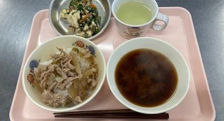 スタミナ丼 チンゲン菜スープ りんごヨーグルト ばなな