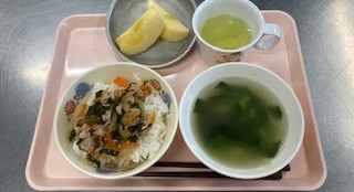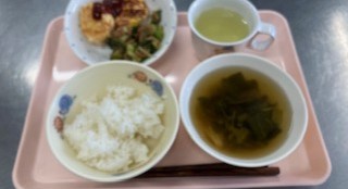 ごはん 豆腐とひじきのハンバーグ 付け合せ 野菜スープヨーグルト 塩せんべい