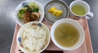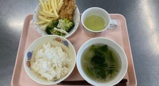 ごはん 中華スープ 白身魚のかりん揚げとポテトフライ 付け合せ牛乳 五平餅