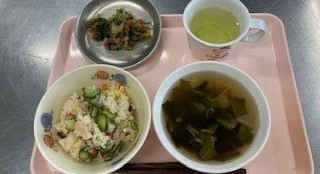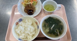 ごはん 白菜スープ 油淋鶏 パイナップルりんごジュース せんべい(クラッカーから変更になりました。)