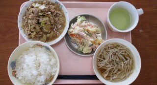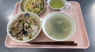 豚丼 ニラスープ 中華風あえ牛乳 せんべい
