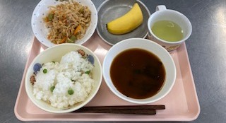 グリンピースごはん みそ汁 鶏肉と切干大根の煮物 バナナコーンスナック カルピス