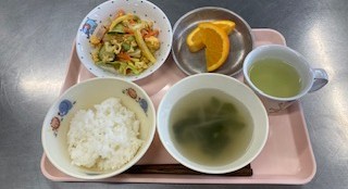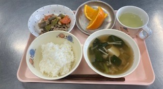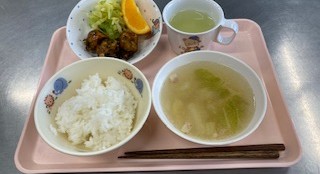 ごはん 白菜スープ ひじきとにらのつくね 付け合せ オレンジビスケット 牛乳