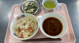 炊き込みごはん みそ汁 白和え飲むヨーグルト クラッカー パイン缶