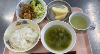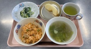 ごはん 春野菜スープ 油淋鶏 りんご牛乳 りんご