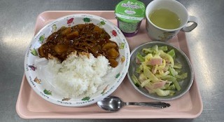 ハヤシライス フレンチサラダ フルーツゼリーせんべい りんごジュース