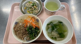 ビビンバ丼 中華スープ アスパラサラダ牛乳 ふのかりんとう